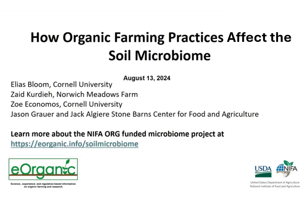 Join this webinar showcasing Cornell University studies on organic practices enhancing soil microbiome diversity and crop resilience. Hear from researchers and local farmers on effective strategies for managing soil health in organic farming.