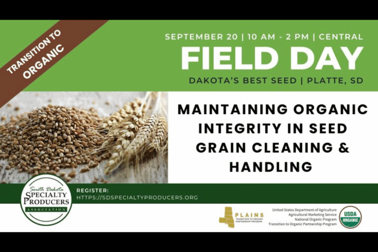 Tune in for a presentation by Dr. Angela Jackson from the South Dakota Specialty Producers Association (SDSPA) during a Dakota’s Best Seed field day about practices and protocols necessary to maintain organic integrity in seed grain production, processing, and handling.